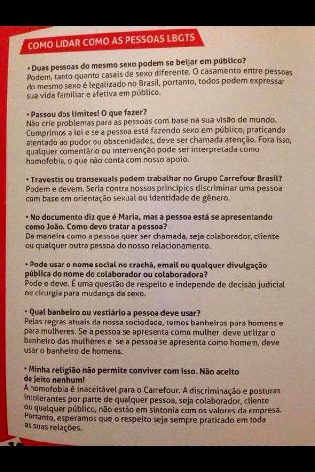 Grupo Carrefour orientando seus funcionários como devem lidar com as pessoas LGBTS:
